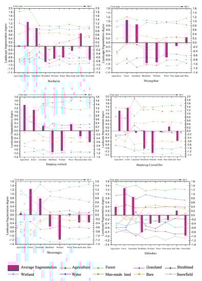 In addition, since most nature reserves are small, with varying shapes and distribution scales, the use of low-resolution data may lead to the mismatch of spatial scales, thus affecting the accuracy of the findings presented herein. Therefore, it is necessary to reveal the landscape fragmentation of each nature reserve from the entire region of the Qinling–Daba Mountains. The present study’s results also indicate that the interiors of some nature reserves are still affected by human activities, especially the nature reserves which have peripheries that are densely populated and highly urbanized. The influence of anthropogenic factors on landscape fragmentation in nature reserves is greater than that of natural factors, basically in agreement with Zhang, J.Q., et al. [].