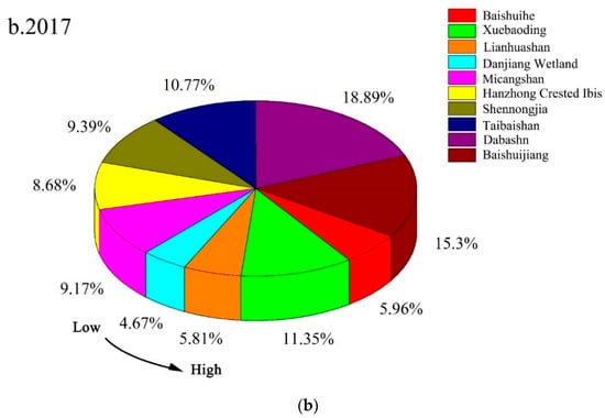 The synthetic variables of the landscape indices of the Qinling–Daba Mountains nature reserves from 2010 to 2017 show that most nature reserves were significantly fragmented (Figure 3). The degree of fragmentation varied among the different types of nature reserves. Its order from high to low in 2010 was Baishuihe > Xuebaoding > Lianhuashan > Danjiang Wetland > Micangshan > Hanzhong Crested Ibis > Shennongjia > Taibaishan > Dabashan > Baishuijiang, and Baishuihe and Xuebaoding exhibited more severe landscape fragmentation than the other nature reserves. In 2017, the greatest to least fragmentation was observed as follows: Danjiang Wetland > Lianhuashan > Baishuihe > Hanzhong Crested Ibis > Micangshan > Shennongjia > Taibaishan > Xuebaoding > Baishuijiang > Dabashan. The landscape fragmentation was particularly significant in Danjiang Wetland and Baishuihe, and the fragmentation degree was the lowest in Dabashan. After 2010, the degree of fragmentation decreased in Taibaishan, Danjiang Wetland, and Hanzhong Crested Ibis in the order of Danjiang Wetland > Hanzhong Crested Ibis > Taibaishan. The fragmentation in their different types of landscapes was improved to a certain extent. In summary, the overall landscape fragmentation in the Qinling–Daba Mountains nature reserves became more severe during the seven years, but the fragmentation in some nature reserves was mitigated.
