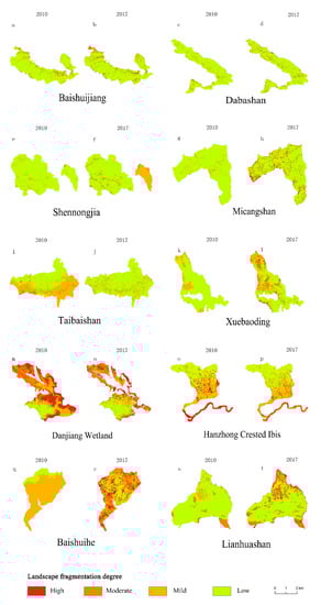 In this study, we took ten typical national nature reserves within the Qinling–Daba Mountains as research objects to explore the degree of landscape fragmentation and its influencing factors in the Qinling–Daba Mountains from 2010 to 2017. The results are as follows.