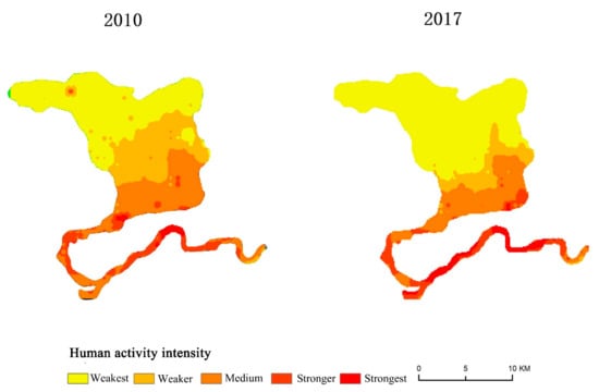 The detection results for the driving factors in the Hanzhong Crested Ibis nature reserve are listed in Table 4. It is shown that the q-statistics of land-use type and human activity intensity were 0.478 and 0.384, respectively, both indicating significant spatial differentiation and high influence strength; the explanatory power of slope factor on regional landscape fragmentation was 0.254, with the least influence. The strength of the influencing factors on landscape fragmentation in the nature reserve ranks in the following order: land-use intensity > human activity intensity > elevation > topographic relief > slope gradient. All influencing factors passed the significance test. Although the overall intensity of human activity in nature reserves exhibited a decreasing trend during 2010–2017 (Figure 5), the explanatory power of human disturbance factors on landscape fragmentation was still more dominant than that of natural factors. The results reveal that the gradual reduction of the natural vegetation area of the forest and grasses was accompanied by an increase in the amount of built-up land and population in the area that had affected the spatial differentiation of the landscape pattern. Therefore, lowering the intensity of human activity within and around nature reserves is crucial for protecting ecological landscape patterns and reducing landscape fragmentation.