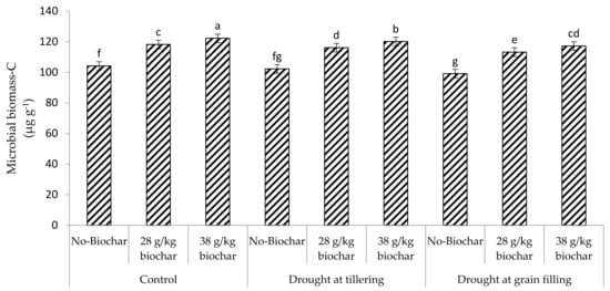 Soil microbial biomass plays a vital role in the decomposition of organic matter. Higher microbial biomass enhances soil fertility and increases the availability of soil nutrients. It also acts as the linkage of the source and sinks between soil nutrients []. Sanaullah et al. [] reported that drought stress condition creates osmotic stress and causes microbial death that creates microbial biomass reduction. More of this organic matter decomposition also decreases with drought stress. Hailegnaw et al., [], Smith et al. [], Al-Wabel et al. [], Martinsen et al. [], Cornelissen et al. [], and many other researchers reported that biochar application enhanced the microbial activities, organic matter, and nutrient content in the soil thereby improving the microbial biomass of the soil, which is helpful in the improvement of soil fertility and plant growth.
