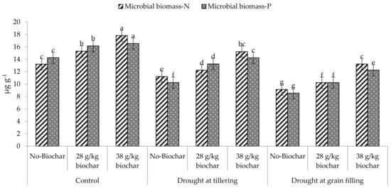 Microbial biomass carbon (MBC), phosphorus (MBP), and nitrogen (MBN) were highest in the soil under full irrigation with the highest biochar amendment (38 g kg−1), but were lowest when drought was imposed at grain filling without biochar addition (Figure 1 and Figure 2). Under the different soil moisture conditions (full irrigation or drought), these soil parameters were greatest with the highest biochar rate but were lowest in unamended soil. Generally, with or without biochar amendment, these parameters were greatest in the soil of fully irrigated crops but were lowest under drought at the grain filling stage.