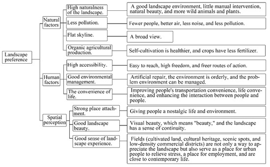 - A good sense of landscape experience considers that cultivated land, cultural heritage, scenic spots, and low-density commercial districts do not only provide a way to appreciate the landscape but also serve as places for urban people to relieve stress, provide places for employment, and are close to contemporary life. Grammatikopoulou et al. (2012) [68] pointed out that organic farming provides a new landscape appreciation, as in our results. Landscape experience involves people’s explorations, including internal operation, experience, and the results of external stimuli acting on people [69]. Cultivated land, cultural heritage, scenic spots, and low-density commercial districts can enhance landscape experience. Residents believe that such places can bring them a sense of relaxation, closer to their needs.
