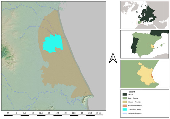 In 1986, the Albufera Natural Park was declared a natural park. It belongs to the list of the most important wetlands globally since 1990. In addition, since 1994 its area has been considered an IBA (important bird area). The National Park covers 21,120 hectares and is located just 10 km from the city of Valencia in Spain. See Figure 1. This wetland has a great biodiversity within its three main groups: