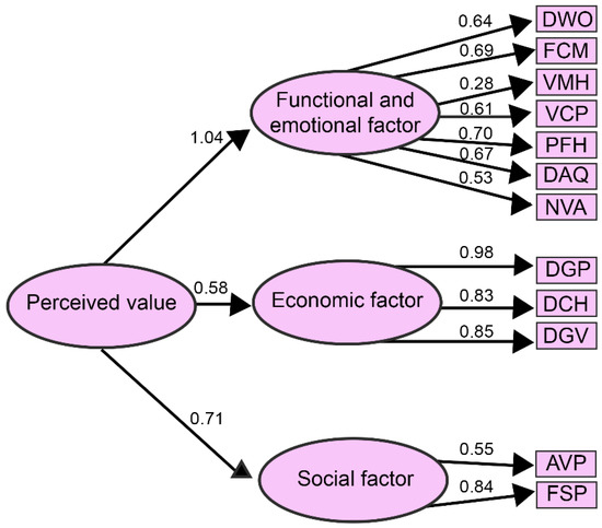 As shown in Table 1, the first dimension was “functional and emotional”, and it is the factor with the highest explanatory power (43.82%) of the total variance, so it was the most important factor compared to the others. Likewise, this factor had the highest number of items in relation to the others. This first factor was linked to the variables of perceived value: the destination is well organized and convenient for me, this visit makes me feel happy, it is calm and pleasant, the people are friendly, the destination has an adequate level of quality, the number of visitors the destination welcomes is acceptable. The second factor was designated as “Economic” and reached a total of 12.45% of the variance. This factor was related to reasonable prices, good value for money, and the destination is cheap. To conclude, the third factor was designated “social” and comprised a total of 8.52% of the variance. This third dimension was linked to the visit of many people I know. Additionally, this visit makes me feel like a special person.