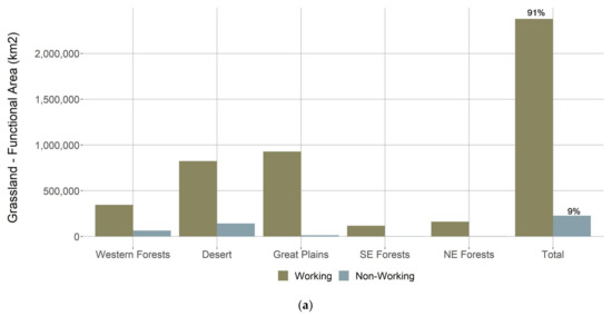 (a) The area of functional Grassland Habitat on working vs. non-working lands by ecoregion. (b) The area of functional Grassland Habitat in private ownership by ecoregion.