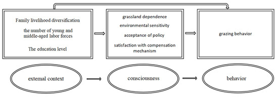 To study the grazing behavior of farmers, we must first understand the psychological mechanism behind the behavior of herders. In 1976, Lewin, a social psychologist, proposed the Lewin Medal of Behavior based on numerous experiments. By distinguishing internal factors and the external environment, Lewin expressed the influence of various factors on the mode, intensity, and trend of individual behavior [22]. Ajzen and Fishbein developed the theory of reasoned action, which suggests that behavior directly depends on the behavioral intention of the individual to perform a specific behavior. Based on the theory of reasoned action, Ajzen and Madden introduced the theory of planned behavior in order to explain individual behavior more reasonably [23]. Guagnano et al. proposed the attitude-context-behavior theory in 1995, pointing out that environmental behavior is the result of the interaction of environmental attitude variables and contextual factors [24]. The theory discovered the influence of two types of factors (internal attitude factors and external contextual factors) on behavior and verified the moderating effect of contextual factors on environmental attitudes and behaviors. On this basis, Wang constructed the consciousness-context-behavior integration model of the influence of resource awareness on resource behavior through qualitative research, pointing out that resource awareness is the prior variable of resource behavior, and the consciousness–behavior relationship is moderated by situational factors [25]. This research has important enlightening significance for explaining the mechanism of the consciousness of herders on grazing behavior.