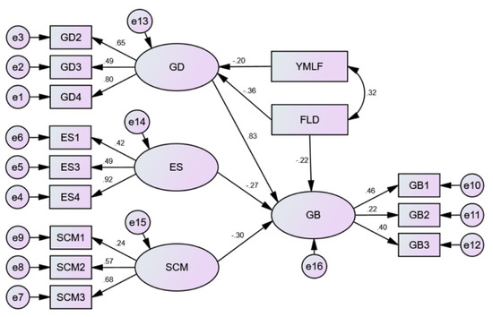 Structural equation model for influencing factors of grazing behavior (GD means Grassland Dependence. ES means Environment Sensitivity. SCM means Satisfaction with compensation mechanism. YMLF means Young and Middle-aged Labor Forces. FLD means Family Livelihood Diversification. GB means Grazing Behavior).