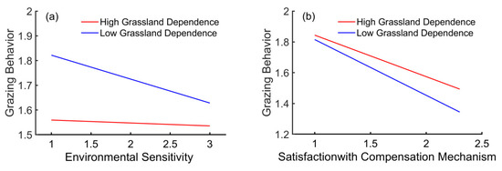 (a) Interaction effects of grassland dependence and environmental sensitivity; (b) Interaction effects of grassland dependence and satisfaction with compensation mechanism.