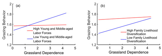 (a) Moderating effects of young and middle-aged laborers on grassland dependence and grazing behavior; (b) Moderating effects of family livelihood diversity on grassland dependence and grazing behavior.