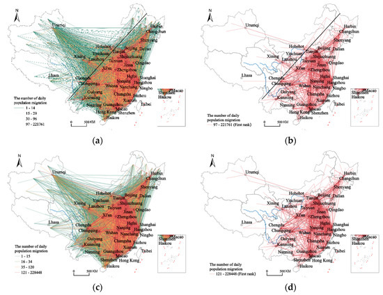 Since the reform and opening up in 1978, population mobility between cities is one of the largest and most influential geographical processes in China [1,2]. Population mobility [3] is considered as the re-allocation of production factors in space; the mobility of population in a specific space promotes the reaggregation and diffusion of social and economic factors, thus reshaping patterns of population distribution [4]. The spatial patterns of population movements reflect the relationship between cities and constitutes important traffic demands between cities [5,6,7]. For a country with a large land area, such as China, analyzing the pattern of population mobility is of great significance for understanding economic and social development.