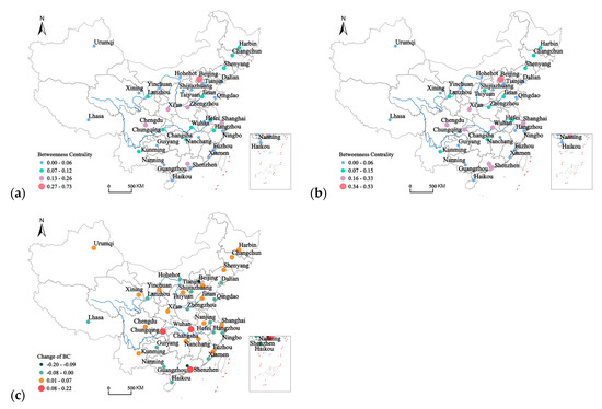 Betweenness centrality of 36 cities on (a) Weekdays and (b) Weekends, and (c).The change of betweenness centrality from weekdays to weekends.