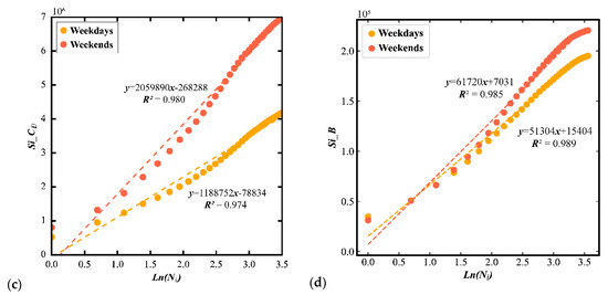 However, although Zipf’s law can be detected across many different countries or regions, it is hard to spot the statistical difference of city sizes from one country/region to another. In other words, the exponents being Zipf distribution only deviate slightly from 1, leading to little meaningful comparison from a statistical perspective. In order to formulate a more nuanced understanding between network metrics on weekdays and weekends, this study borrowed the idea of a rank cumulative size model [28], stated by the following equation: