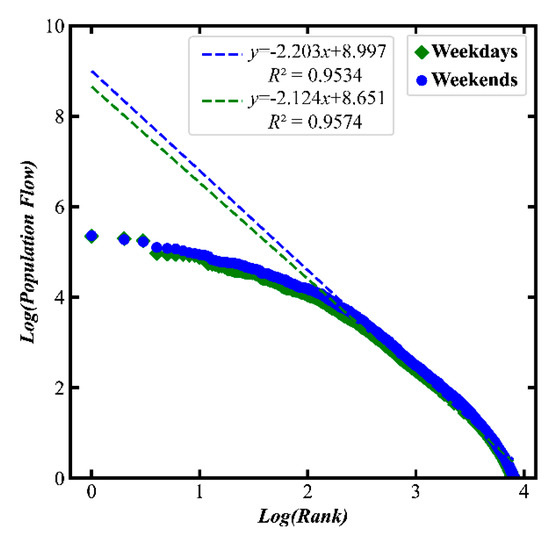 Scatter plot of the Rank-Population Flow on weekdays and weekends.
