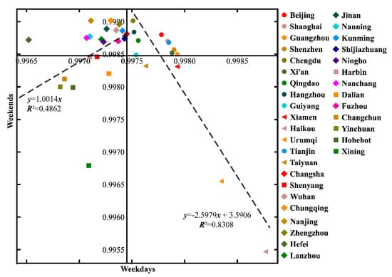 With the unbalance movements in terms of the amount of flow between cities, it was intriguing to measure the diversity score for each city. The diversity score of each city, hereby, quantifies how different the movement flows associated with this city. As the score is rooted from Shannon entropy, the smaller the absolute value (ranges in [0,1]) is, the higher diversity the scope implies. High diversity score refers to the amount that flows distribute more unevenly from this city to other cities. For visualization purposes, we used 1- diversity to show the results in order to make sure that values increase from lower left to upper right. Figure 6 shows the correlation of network diversity of the above-mentioned major cities for weekdays and weekends (except Lhasa). Individual cities were plotted with their diversity scores on weekdays (X-axis) and weekends (Y-axis), respectively. Overall, the correlation between diversity scores on weekdays and weekends was not linear but best-fitted using a second-order polynomial function with a R2 square value of 0.64, from which we split the fitting curve at the tangent point into two subsets: a positive linear correlation (with R2 square value 0.83) and a negative one (0.48).