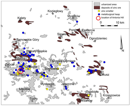 Upper Silesia and Dąbrowski Basin abound in areas contaminated by toxic metals, remains of the former production of silver, lead, and zinc [49,69,71,72,73]. The mineral used to produce zinc and lead is mainly the dolomite CaMg(CO3)2, in the form of a blend containing a considerable amount of sphalerite ZnS and galena PbS. Other zinc ores are the effects of sphalerite oxidisation and appear in the form of a blend of zinc carbonates and silicates. They are accompanied by iron sulphides FeS2 in the form of marcasite and pyrite, which makes the hue of the zinc ores red and brown [79].