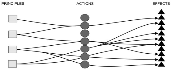 Each object has its own conditions. In addition, a group of aims to be realised always depends on the local expectations, possibilities, and the social approval. It is not possible to implement aims that exclude each other or are in conflict, which is also true for complicated ideas like sustainable development. The most important aim is defined in the designing process for a given object. Particular aims must match others and realise their own specific individual path, and not all the paths. Otherwise, the most important one will be blurred. The holistic model mentioned above shows the relations between principles, actions, and their effects (Figure 5).