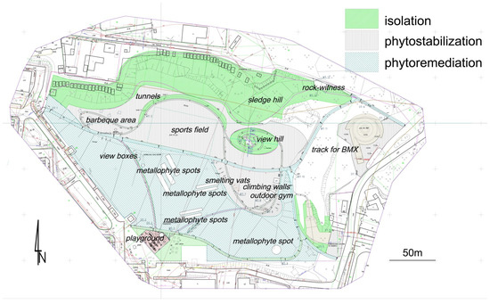 In order to counteract the hidden danger it is necessary to look for allies in nature. Afforestation, for instance, can play a significant role in the phytoremediation of contaminated soils [29]. The process consists in absorbing contamination by tree tissues [30]. It is related, however, to the sequestration within the plant tissue, mainly the root, but also the leaves, sap, and resin, i.e., the objects that could be touched by the potential users, including children, which may be dangerous for their health. In addition, plants are not indifferent to potentially hazardous element content. In order to survive, efficient support must provided by the presence of microbes, fungi, and bacteria in the rhizosphere [31]. A particularly positive role is played here by mycorrhiza, which was examined in this respect in its relation to Populus tremula [32]. This species spreads freely in Antonia Hill. The positive influence of microbes and bacteria in contaminated areas has been well-documented [33]. Observation of the greenery present in Antonia Hill showed that Quercus robur, Betula pendula, Sorbus aucuparia, and Populus tremula coped best in these conditions. These species were accepted for planting despite a certain risk of acidification of the soil by oak leaves. The meadows and lawns, however, are to be mowed regularly and the leaves thus removed. The mowing material is to be composted and used for further fertilisation of the land along with lime fertilisers. The post-zinc spoil heaps compost is to be used in the same locations, so as not to transfer the contamination elsewhere, but on indicated spots away from the play area. To reduce the contamination, it will also be mixed with material from other sites and used in other locations.