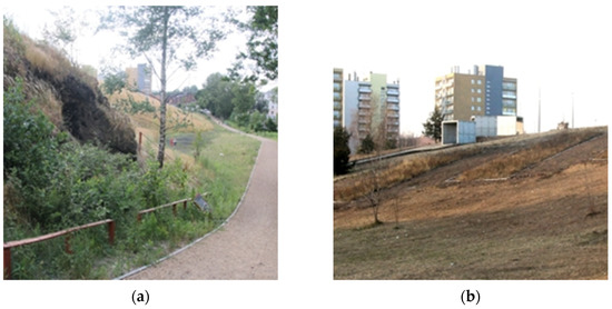 Fragments of the natural plant cover left to allow the process of natural succession and to contribute to the enrichment of the local flora, also as traces of Antonia Hill’s natural history: (a) A fragment of the slag cliff with metallophytes as a rock witness to the history of the place; (b) the metallophyte spots highlighted by concrete curbs on the south slope.