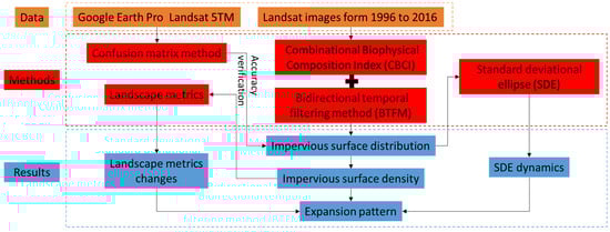 In 2014, 54% of the global population, or 3.9 billion people, lived in urban areas [1]. Urban sprawl can lead to various environmental issues, and one of the most prominent ecological changes is caused by the expansion of impervious surfaces [2]. Impervious surfaces are typically associated with anthropogenic urban land uses, and these surfaces prevent water infiltration into the soil and absorb heat from sunshine during the day before releasing it slowly at night [3,4]; examples of impervious surfaces include rooftops, parking lots, roads, driveways, and sidewalks [5]. Previous studies have shown that impervious surfaces have a significant impact on the structure and function of terrestrial ecosystems, biogeochemical cycles, and urban environments and can result in high surface runoff [6,7], air pollution [8,9,10], the transport of aquatic pollutants [11], water quality degradation [12], and urban heat island effects [13,14]. Therefore, impervious surfaces can be considered a key indicator of the urban environment [15].