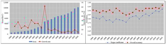 The results of the accuracy verification are shown in Figure 5 (right). The average overall accuracy and Kappa coefficient of the impervious surface maps from 1994 to 2016 were 0.91 and 0.83, respectively. The relatively low accuracies of the results from 1994 to 2008 were due to the effects of cloud cover and low image quality; thus, the average overall accuracy was 0.89, and the Kappa coefficient was 0.8. In addition, the impervious surface images from 2009 to 2016 had relatively higher accuracies; the mean overall accuracy was 0.94, and the Kappa coefficient was 0.88 (see Figure 5, right). The dynamic changes in the ISA from 1994 to 2016 are presented in Figure 5 (left), which shows the different spatial patterns over the past two decades. Overall, the impervious surfaces of the GHM Bay Area rapidly expanded from 569.23 km2 in 1994 to 10,200.53 km2 in 2016, with an average annual growth rate of 51.7%. Moreover, the ISA represented 0.9% of the total area of the GHM Bay Area in 1994. However, it accounted for 17% of the total area of the GHM Bay Area in 2016. In 1994, most impervious surfaces were aggregated in Guangzhou, Shenzhen, and Hong Kong. After 1999, the expansion of impervious surfaces increased rapidly. With the fast urbanization process, a new urban core appeared in Foshan, which is located in the southwestern region of Guangzhou. Then, another urban core emerged in Dongguan in 2006, which is located in the southeastern region of Guangzhou. Furthermore, the expansion of impervious surfaces in Dongguan and Shenzhen mainly occurred along the Pearl River and the coastline of the GHM Bay Area.