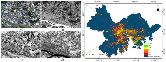 (a) True-color Landsat 8 OLI imagery; (b) the combinational biophysical composition index (CBCI) image; (c) the modified bare soil index (MBSI) image; (d) the optimized soil adjusted vegetation index (OSAVI) image, and (e) the dynamic changes in the ISA in the GHM Bay Area from 1994 to 2016.