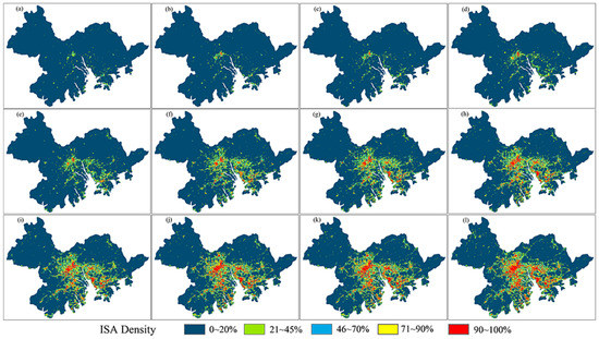 ISA density in each year: (a) 1994; (b) 1996; (c) 1998; (d) 2000; (e)2002; (f) 2004; (g) 2006; (h) 2008; (i) 2010; (j) 2013; (k) 2014, and (l) 2016.