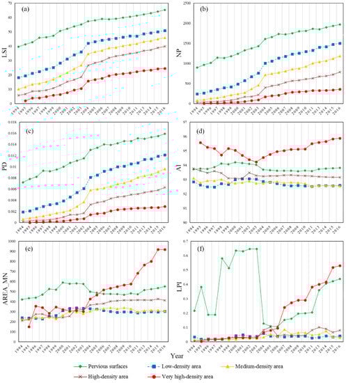 The dynamics of six different landscape metrics for five ISA density groups over the entire study period are depicted in Figure 8. Note that the ISA in 1994 has only four ISA density groups except very high-density area, due to the small quantity and limited dispersion of ISAs in 1994. The LSI, NP, and PD displayed similar increasing trends between 1994 and 2016 (see Figure 8a–c). Pervious surfaces exhibited the highest values, followed by the low-density area, the medium-density area, and the high-density area. Furthermore, the very high-density area displayed the lowest values from 1994 to 2016. For the landscape metric AI (see Figure 8d), the very high-density area still exhibited the highest values, with a minimum observed in 2004. Previous surfaces displayed the second-highest AI values from 1994 to 2016, followed by those of the high-density area. However, the low-density area and the medium-density area had approximately the same AI values, especially after 2011. The AREA_MN trend of each ISA density group (see Figure 8e) indicated that the value of the very high-density area increased rapidly, especially after 2004. Before 2005, the value of the very high-density area was lower than that of pervious surfaces. Moreover, the value of the low-density area peaked in 2002 and then began to decrease. The value of the medium-density area displayed an overall increasing trend and reached a peak in 2009. In addition, the value of the high-density area increased gradually, and this value was higher than those of the low-density area and the medium-density area after 2003. Figure 8f reveals the dynamics of the LPI for the five ISA density groups. The LPI value of pervious surfaces experienced a drastic change from 1994 to 2004. Notably, it fluctuated between 1994 and 2000 and then decreased sharply from 2003 to 2004. After 2004, the value began to rapidly increase, especially after 2011. The LPI value of the very high-density area increased slowly until 2006 but then sharply increased. In addition, the LPI values of the low-density, medium-density, and high-density areas slightly increased and reached peaks in 2004, 2007, and 2013, respectively.