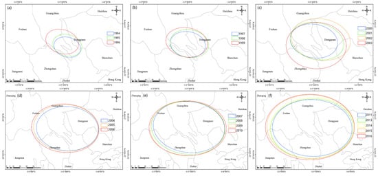 The standard deviational ellipses of the GHM Bay Area (a) between 1994 and 1996; (b) between 1997 and 1999; (c) between 2000 and 2003; (d) between 2004 and 2006; (e) between 2007 and 2010; (f) between 2011 and 2016.