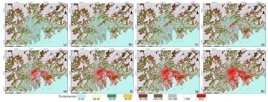 The ISA distribution at different elevation levels (a) 1994; (b) 1997; (c) 1999; (d) 2003; (e) 2006; (f) 2010; (g) 2013, and (h) 2016.