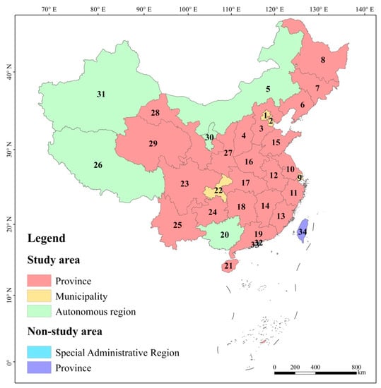 The study area consisted of 31 provincial-level administrative units in China (excluding Hong Kong, Macao, and Taiwan), including 22 provinces, 4 municipalities, and 5 autonomous regions, which are presented in Figure 1.