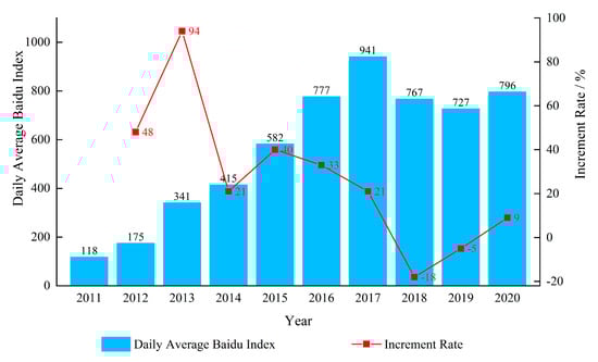 Figure 2 shows the annual daily average Baidu index for “Beautiful Villages” (hereinafter referred to as the Baidu index) and the increment rate on the national level from 2011 to 2020. During this period, the public attention towards beautiful villages (hereinafter referred to as the public attention) increased year by year from 2011 to 2017. The increment rate in 2013 was 94%, indicating that public attention in 2013 was almost double that in 2012. This may have been due to the fact that Document No. 1 of the Central Committee was released that year, which pledged “To promote the construction of rural ecological civilization and strive to build beautiful villages”. This may have triggered widespread attention. In 2018–2020, the Baidu index was characterized by a fluctuating trend, with a decrease of 18% in 2018 and an increase of 9% in 2020, although, overall, the Baidu index remained high, indicating strong momentum regarding public attention.
