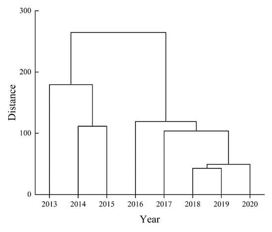 Furthermore, time-constrained clustering was introduced to objectively divide the time stages of public attention evolution and summarize temporal characteristics. The results from 2013 to 2020 are shown in Figure 4. We can see from Figure 4 that the optimal number of clusters was two. During 2011–2020, Chinese public attention towards beautiful villages could be divided into three stages, i.e., the first stage from 2011 to 2012, the second stage from 2013 to 2015, and the third stage from 2016 to 2020. The first stage is where the foundation was laid. In this stage, the construction of beautiful villages had only started in Zhejiang and Fujian, which did not attract national public attention, and thus, the Baidu index for each province was very low. In the second stage, the introduction of national policies and the practice of building beautiful villages in various places had increased public attention, and the Baidu indexes rose rapidly. In the third stage, the positive impact of beautiful countryside construction was being felt, and the associated concepts had become rooted in people’s minds; thus, the Baidu index remained at a high level.