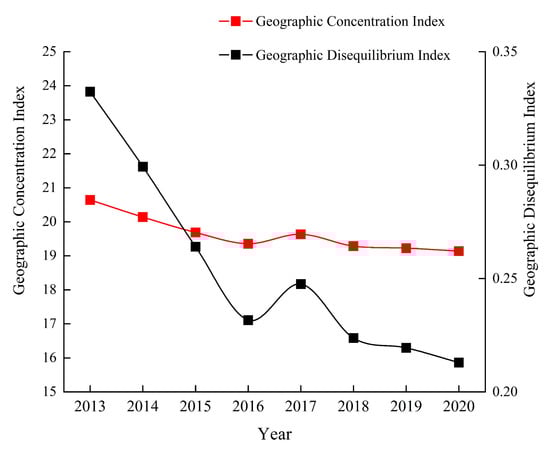 Figure 6. Geographic concentration index and disequilibrium index for public attention from 2013 to 2020.