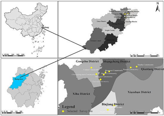 Hangzhou city is the central city of the Yangtze River Delta in China. According to statistics, its urbanization rate was 83.29% in 2020, far above the national average. The construction of resettled communities for landless peasants in Hangzhou started early and developed rapidly in recent years, resulting in a gradual increase in community spatial conflicts. Between July and September 2020, we selected ten typical resettled communities in Hangzhou as the study area (Figure 1). These sample communities have the following characteristics: (1) There are various types. Some communities were built over ten years or more, some were built in five to eight years, and others were built in approximately three years. (2) Population heterogeneity is evident. Community residents include landless peasants resettled from local villages, and landless peasants resettled from other villages, urban residents who buy houses in the community, etc., which bring diverse needs and make the conflicts more complex. (3) There are many news reports related to spatial conflicts in these communities. Therefore, the typicality of the case area was guaranteed.
