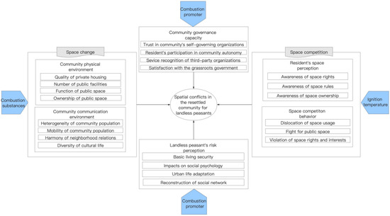 In this paper, the core category is “the spatial conflict in the resettled community for landless peasants.” Based on the social combustion theory, the storylines are as follows: in the urbanization process in China, the establishment of the resettled community first realized the transformation of the community’s physical environment and community communication environment. The rapid change in the space environment is the source factor; in other words, it is the “combustion substance” of the generation process of spatial conflicts. Thus, landless peasants’ risk perception will directly affect their spatial behaviors. Moreover, the transformation of the governance structure of such communities lags behind the transformation of space; therefore, it is difficult for the community governance capacity to match the needs of community spatial governance, which indirectly affects the occurrence of spatial conflicts. Therefore, landless peasants’ risk perception and community governance ability have become the two “combustion promoters.” Under the catalysis of the combustion promoters, the temperature of the combustion substance gradually increases, and the phenomenon of space competition intensifies. As a contributor to bringing the situation to the “ignition temperature,” space competition breaks through the threshold, and then it will lead to community spatial conflicts. Based on the storyline, we constructed a new conceptual model, as shown in Figure 2.