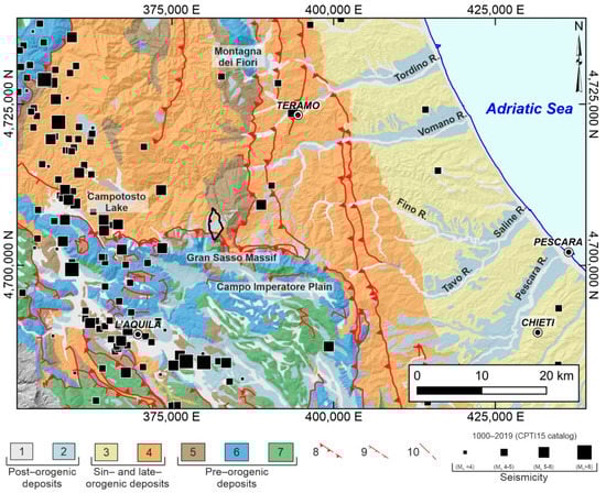 Geological map of NE Abruzzo (modified from []). Legend: post-orogenic deposits—(1) fluvial deposits (Holocene) and (2) fluvial and alluvial fan deposits (Middle-Late Pleistocene); sin- and late-orogenic deposits—(3) hemipelagic sequences with conglomerate levels (Late Pliocene–Early Pleistocene) and (4) turbiditic foredeep sequences (Late Miocene–Early Pliocene); pre-orogenic deposits—(5) carbonate ramp facies (Early Miocene-Early Pliocene), (6) slope and pelagic basin sequences (Cretaceous–Miocene), and (7) carbonate platform sequences (Jurassic–Miocene); (8) major thrust (dashed if buried); (9) major normal fault (dashed if buried); and (10) major fault with strike-slip or reverse component (dashed if buried). Seismicity derived from the CPTI15 catalog []. The black line indicates the location of the study area.