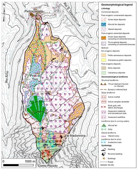 From a geomorphological standpoint, the most recurrent features are represented by structural, slope, fluvial, and glacial landforms (Figure 6). Concerning structural ones, in the southernmost sector, a W–E-oriented is detectable, overlapping calcareous deposits on overturned marly deposits. A second buried thrust is not clearly observable, but its existence can be inferred through minor in-field exposures that highlight the overlapping of marly deposits over sin-orogenic pelitic-arenaceous deposits. Slope landforms partly consist of active rockfalls and complex landslides in the northern sector near Pietracamela.