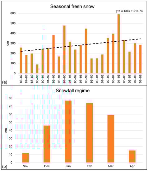 Seasonal fresh snow trend for the timespan 1986–2009 (a) and snowfall regime (b) at the Prati di Tivo gauge (1450 m a.s.l.).