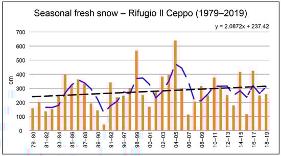 As graphically reported in Figure 11, the nivometric trend spanning over a 40-year time period (1979–2019) confirms the increase of snow precipitation. However, it is less marked than that evident for the Prati di Tivo area (Figure 8a), with a minimal difference in the recent interseasonal variations (2.1 cm vs. 3.1 cm/season), whose trends are increasingly marked.