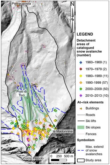 The snow avalanche inventory was retrieved from the State Forestry Corps of Italy and the Abruzzo Region (http://opendata.regione.abruzzo.it/content/carta-storica-della-valanghe, accessed on 15 May 2021) and allowed us to clearly describe the avalanches’ spatial distribution over the study area. Moreover, it was integrated with information derived from the available literature and technical reports [,,].