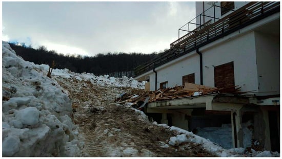 - Braun, T.; Frigo, B.; Chiaia, B.; Bartelt, P.; Famiani, D.; Wassermann, J. Seismic signature of the deadly snow avalanche of January 18, 2017, at Rigopiano (Italy). Sci. Rep. 2020, 10, 18563. [Google Scholar] [CrossRef]