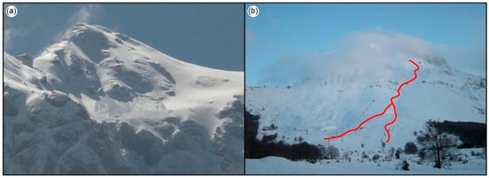 - Significant sudden temperature changes occurring more frequently after or during snowfalls generally disfavor the cohesion process between the strata composing the snow cover, thus causing a hypothetical increase of the avalanche hazard. Nevertheless, a clear Mediterranean type, the climatic extremization, and a not-excessively-high elevation determine an early beginning of the accelerated destructive metamorphism processes, with a subsequent quick decrease of the snow depth values on the ground up to the maximum elevation of avalanche-prone areas. Furthermore, close to detachments areas, a strong wind power occurring during and after snowfalls induces rapid mechanical metamorphism. In the case of intense snow events followed by exceptionally cold climatic phases and variable weather conditions, destructive metamorphism processes take place very slowly; constructive metamorphism is indeed established. The thickness of the snow cover remains relatively abundant for a long time (Figure 10b).