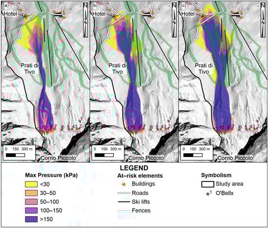 In conclusion, this stepwise sequence was completed by avalanche simulation models. In detail, 1- and 2-dimensional avalanche simulation models (e.g., AVAL-1D and RAMMS [,]) were applied both to back-analyze documented avalanche events at a particular site, as well as to estimate the consequences of possible hazard scenarios. According to the literature and technical data [,,], the main nivometric parameters required for dynamic avalanche modeling are represented by the maximum height of the snow cover (Hs) and the increase of the snow cover height over three consecutive days (Dh3gg). For developing the present study, an increase of 5 cm of new snow and a snow cover for every 100 m of elevation was proposed, taking into account the aforementioned literature data and the nivological expert judgment. These physical–mechanical characteristics, together with ancillary information concerning the physiography, steepness, and roughness of the ground, the presence of infrastructures s.l. were reported on a 5-m grid DTM base map and elaborated in a GIS environment.