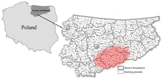 Given the selective and, in most cases, outdated statistical and literature data concerning the characteristics of hunters in Poland, the acquisition of data describing this social group was based on the diagnostic survey method. The study involved hunters hunting in different parts of north-eastern Poland. The area selected for the study, comprising several dozen hunting districts of Warmińsko-Mazurskie Voivodeship, is characterised by very favourable conditions for hunting (the percentage of agricultural land in a particular area is about 40%, and that of forests is about 50%), and the percentage ratio of hunters to the general population is one of the highest in Poland [] (Figure 1).