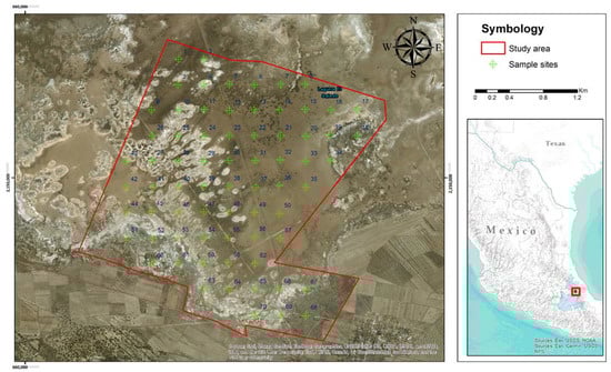 The study area was located in the common lands of the south-central portion of the municipality of Tepeyahualco in the state of Puebla, Mexico (Figure 1). The study area had an extension of 746 ha, and the predominant vegetation was halophilic. This type of vegetation inhabits saline, alkaline, and poorly drained soils at the bottom of old lakes, and usually at an altitude of no more than 2250 m. It takes the form of low, dense grassland dominated by grasses that reproduce vegetatively by rhizomes and stolons [14].
