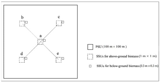A two-stage cluster sampling design was implemented in the field [15,16], in which the primary sampling unit (PSU) was a square plot of one hectare (100 m × 100 m) and the secondary sampling units (SSU) were square plots of 1 m2 (1 m × 1 m) for aboveground biomass and square plots of 0.09 m2 (0.3 m × 0.3 m) for belowground biomass. The 1 m2 SSUs, nested within the PSU, were geometrically arranged in the shape of an X: SSU “a” was located at the centre of the PSU; SSUs “b”, “c”, “d”, and “e” were found at the vertices of a hypothetical square centred on SSU “a”. The 0.09 m2 SSUs were located adjacent to the 1 m2 SSUs (Figure 2). SSUs nested in PSUs for sampling minor vegetation (herbs, ferns, and mosses) are common in large-scale forest inventories [11].