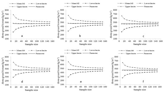Confidence intervals for estimation of aboveground biomass from six analysis methods ((a) M1, (b) M2, (c) M3, (d) M4, (e) M5, and (f) M6) and 15 sample sizes.