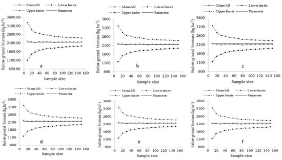 Methods 3 and 6 led to the same point values of belowground biomass. For all sample sizes, a slight underestimation was observed. The maximum relative bias was −0.0329, which corresponded to 2088.27 kg ha−1 for sample size 80. The confidence intervals of both methods were similar and wide at small sample sizes; e.g., for sample size 10 of method 3, the estimate was from 1129.42 to 3160.56 kg ha−1, and for sample size 150, from 1892.25 to 2330.47 kg ha−1 (Figure 4).