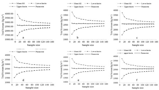 Confidence intervals for total biomass estimation from six analysis methods ((a) M1, (b) M2, (c) M3, (d) M4, (e) M5, and (f) M6) and 15 sample sizes.